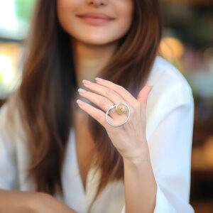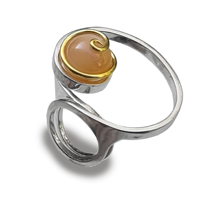 Clearly Koleksiyonu’nun benzersiz tasarım anlayışını yansıtan bu yüzük, 925 ayar gümüş üzerine 22 ayar altın kaplama detaylarla tamamlanmıştır. Yüzüğün merkezinde yer alan Ay Taşı (Moonstone), mistik parlaklığı ve doğal güzelliği ile dikkat çeker. Her yüzük, taşın doğal yapısına ve eşsiz desenlerine bağlı olarak tamamen el yapımı üretilir ve kullanıcıya özel bir deneyim sunar.