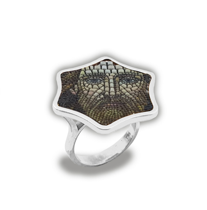 Altıgen çerçevede yer alan Hz. İsa’nın portresi, manevi ve sanatsal bir ifade sunar. El yapımı mozaik işçiliği ve modern tasarımıyla bu yüzük, inanç ve estetiği bir araya getiren benzersiz bir parçadır.