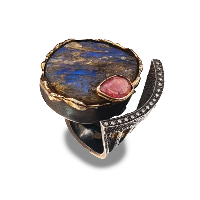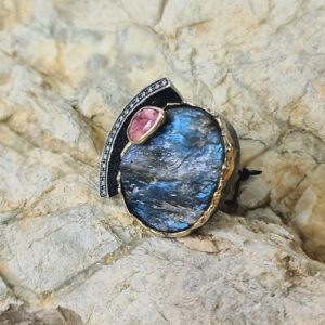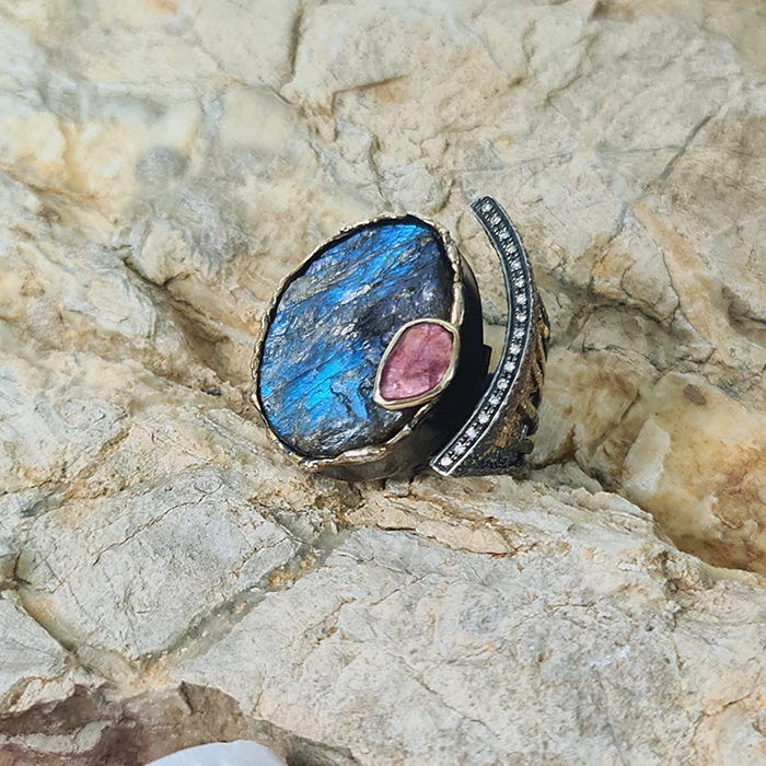 Gold Lava Koleksiyonu’nun bu özel tasarımı, ışığa göre renk değiştiren labradorit ana taşı, pembe turmalin ve pırlanta detaylarıyla öne çıkıyor. Gümüş ve 18 ayar altının modern dokunuşuyla hazırlanmış yüzük, sanatsal ve zarif bir tasarım sunuyor. Her yüzük, doğal taşların eşsiz yapısına uygun olarak elde hazırlanır. Günlük stilinize şıklık katmak için idealdir.