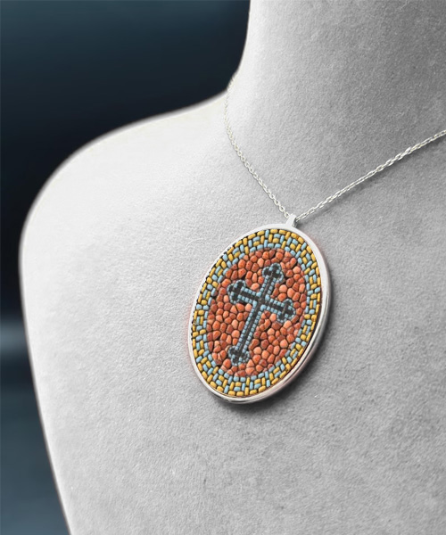 Kolye tasarımında kullanılan mozaik taşlar, haç figürünü ön plana çıkaran mavi, altın sarısı ve bej tonlarıyla özenle bir araya getirilmiştir. Her bir taş, inancın zamansız güzelliğini yansıtacak şekilde dikkatlice yerleştirilmiştir.