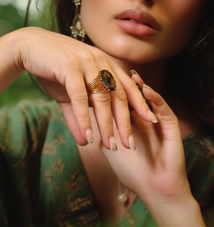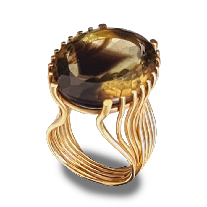 Vintage zarafetini modern işçilikle harmanlayan bu özel tasarım yüzük, gümüş üzerine altın kaplama ile hazırlanmıştır. Yüzüğün merkezinde yer alan doğal smoky quartz taşı, derin kahverengi tonları ve dumanlı görünüme sahip benzersiz dokusuyla dikkat çeker. Zarif tırnak detayları ve dalgalı hatlara sahip yüzük bandı, tasarımın vintage şıklığını ön plana çıkarır.