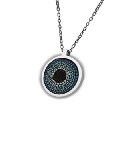 Kolye, geleneksel nazar boncuğunun modern bir yorumu olarak düşünülmüş olup, ortasında dikkat çeken siyah merkez bölümü güçlü bir odak noktası oluştururken, çevresindeki mavi ve gri tonları huzuru ve koruyucu enerjiyi temsil etmektedir. Mozaik desenindeki detaylar, iç içe geçmiş halkalar ile bir bütünlük ve denge hissi yaratırken, kolyeyi takan kişiye nazik bir koruma ve pozitif enerji sunmayı amaçlamaktadır.