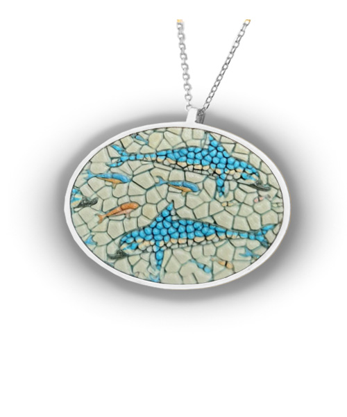 Bu özel kolye tasarımında, antik mozaik sanatının estetik dokusu modern bir bakış açısıyla harmanlanmıştır. Turkuaz ve mavi tonlarında işlenen yunus figürleri, açık bej zemin üzerinde adeta denizde süzülen bir görüntü yaratmaktadır. Mozaik desenindeki detaylar, yunusların hareketliliğini ve enerjisini ustaca yansıtarak kolyeye dinamik bir görünüm kazandırmaktadır.